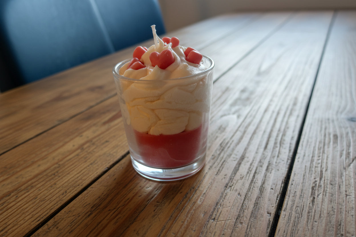 Romantična ročno izdelana sveča iz 100 % sojinega voska, oblikovana kot zapeljiva sladica v kozarcu. Nežen in sladek vonj jagode z vanilijo napolni prostor s toplino, romantiko in občutkom razvajanja.