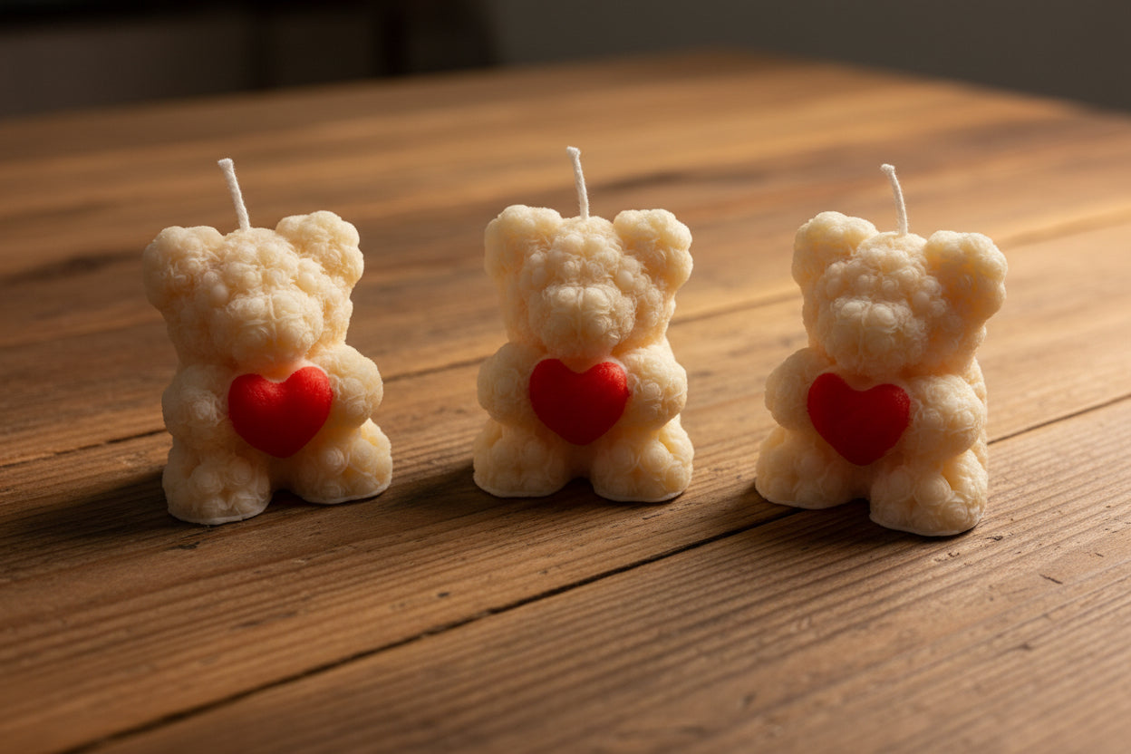 Prikupna sojina svečka v obliki medvedka je del posebne valentinove kolekcije, ustvarjene za trenutke ljubezni, topline in pozornosti. Izdelana je iz 100 % naravnega sojinega voska, ki gori čisto, počasneje in brez škodljivih snovi.
