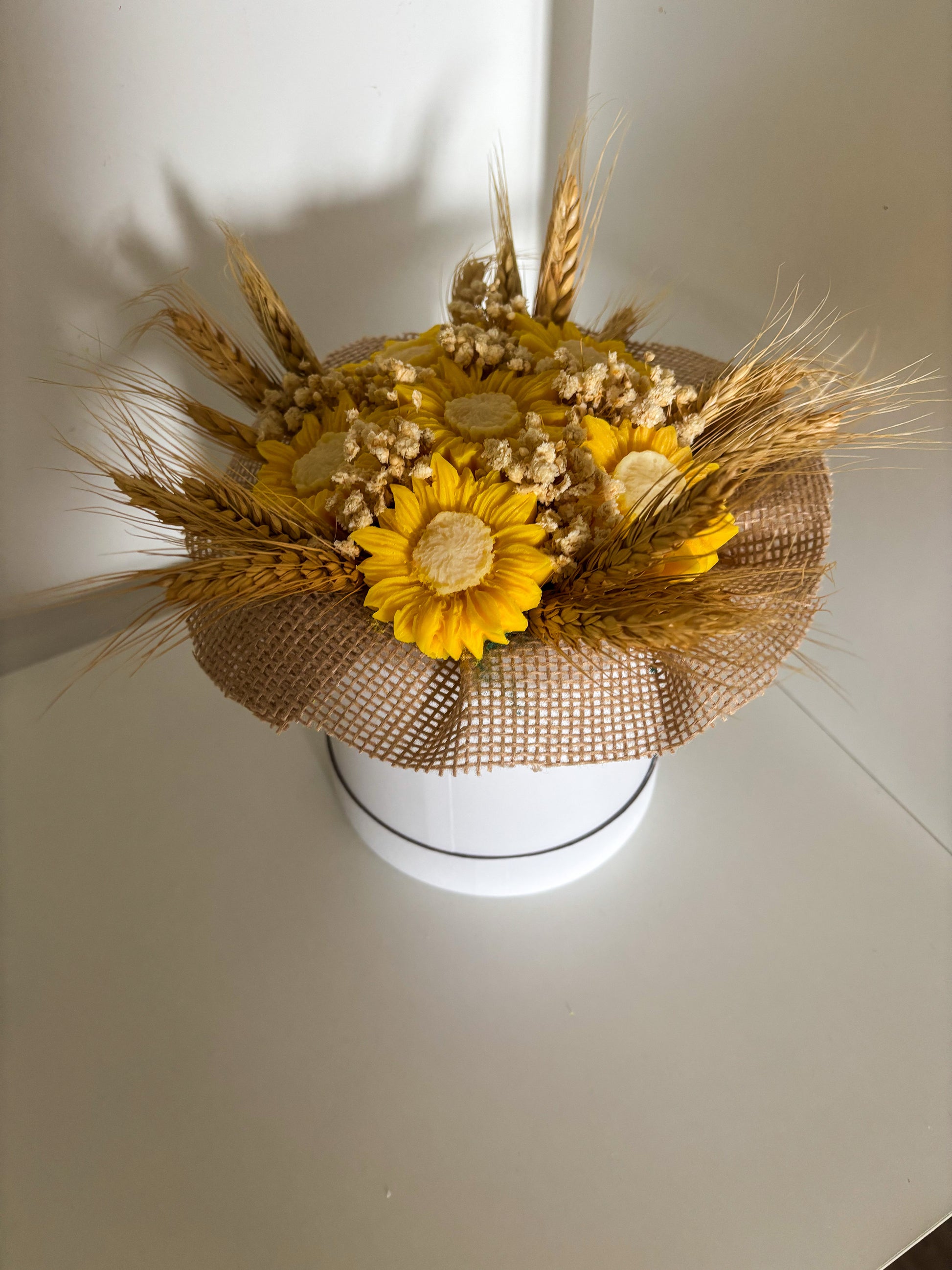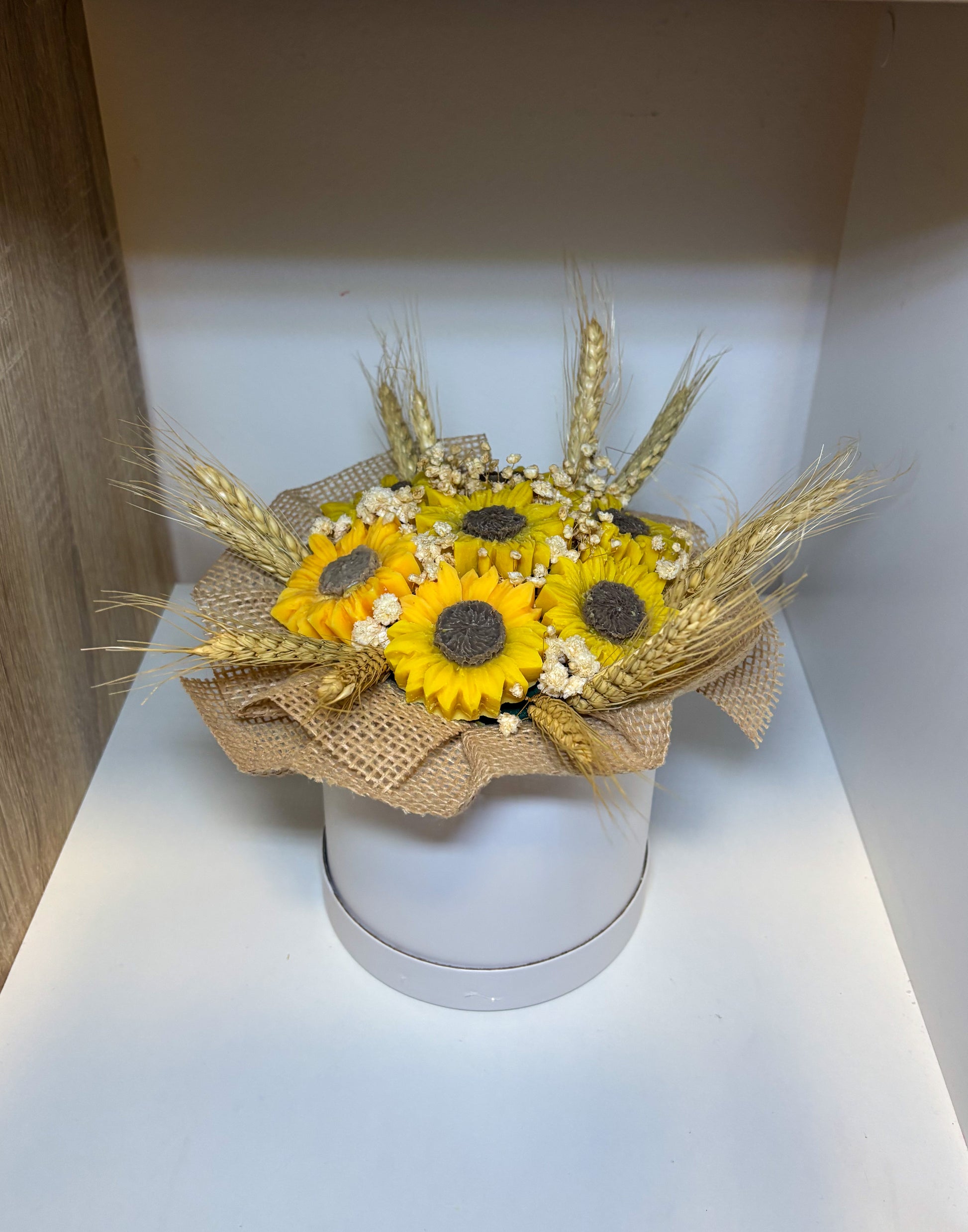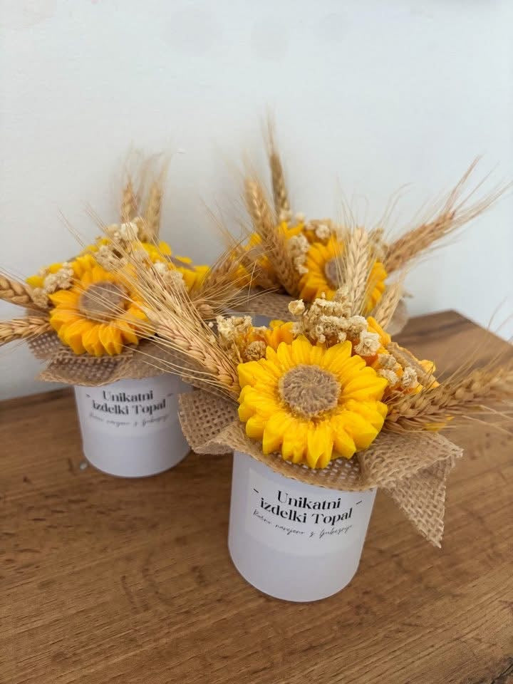 Ročno izdelan šopek sončnic iz voska, ki nikoli ne ovene. Vsaka cvetlica je oblikovana z natančnostjo in ljubeznijo do detajlov, zato je šopek čudovit dekorativni kos ali unikatno darilo.