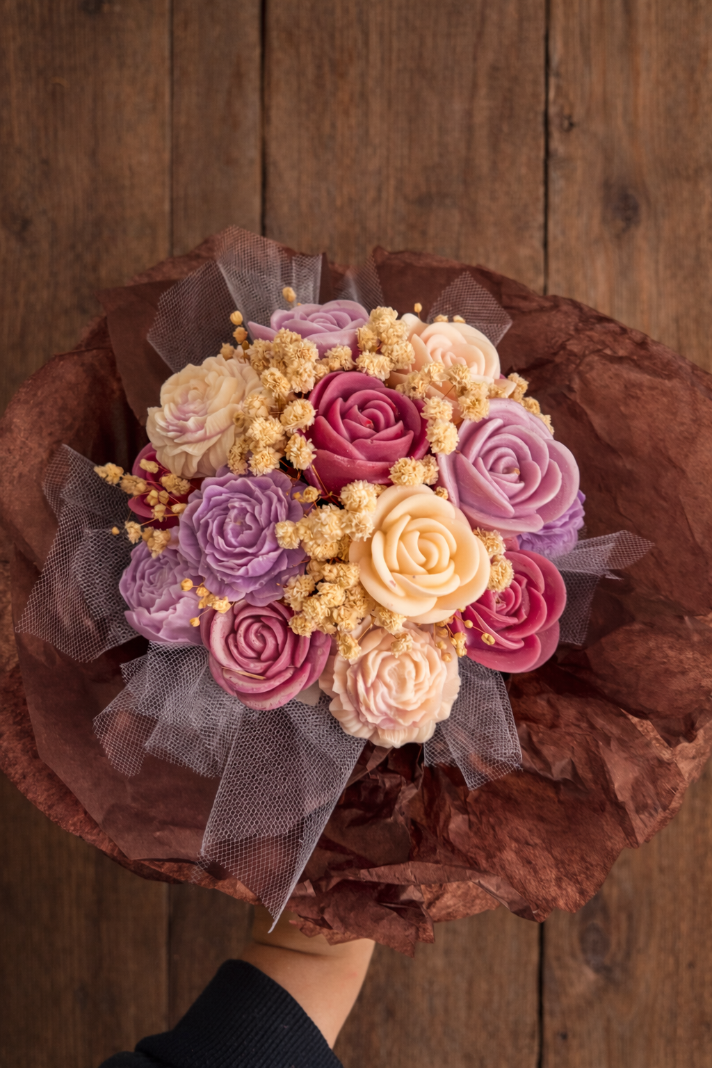 Ročno izdelan dekorativni šopek iz naravnega sojinega voska, oblikovan v nežne cvetove. Šopek je estetsko dovršen, mehak na pogled in čudovita alternativa klasičnemu cvetju, saj ne oveni in dolgo ohrani svoj videz.