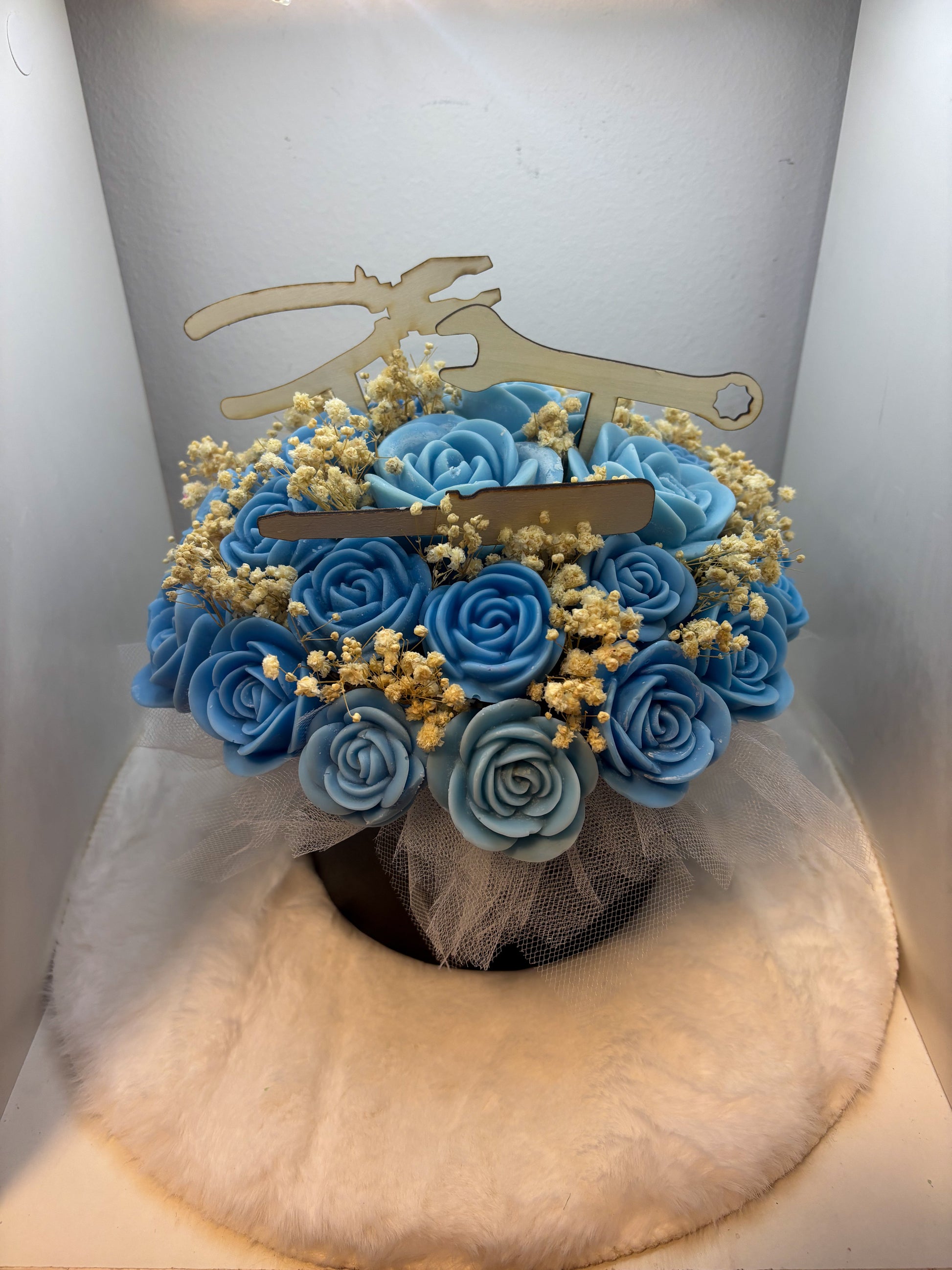 Edinstven šopek za mehanika z ročno izdelanimi modrimi vrtnicami in unikatnim lesenim dekorjem v obliki orodja. Popolno darilo za avto-mehanike, mojstre in tehnike. Idealno za rojstni dan, obletnico ali kot posebna dekoracija delavnice. Trajen, estetsko dovršen in popolnoma prilagodljiv.