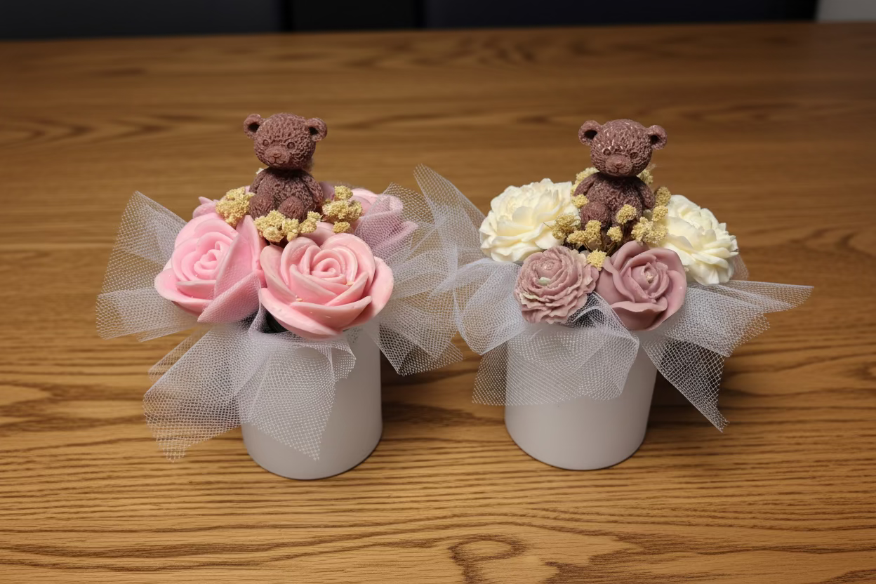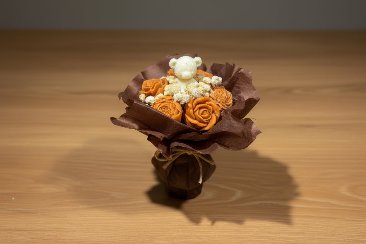 Ročno izdelan dekorativni šopek iz naravnega sojinega voska, oblikovan v nežno cvetlično kompozicijo z ljubkim medvedkom. Šopek je čudovita alternativa klasičnemu cvetju, saj ne oveni in ostane trajen spomin.