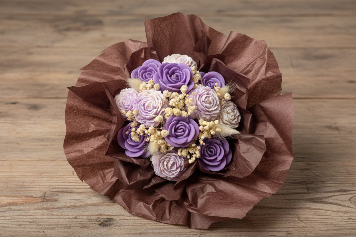 Ročno izdelan dekorativni šopek iz naravnega sojinega voska, oblikovan v nežne cvetove. Šopek je estetsko dovršen, mehak na pogled in čudovita alternativa klasičnemu cvetju, saj ne oveni in dolgo ohrani svoj videz.